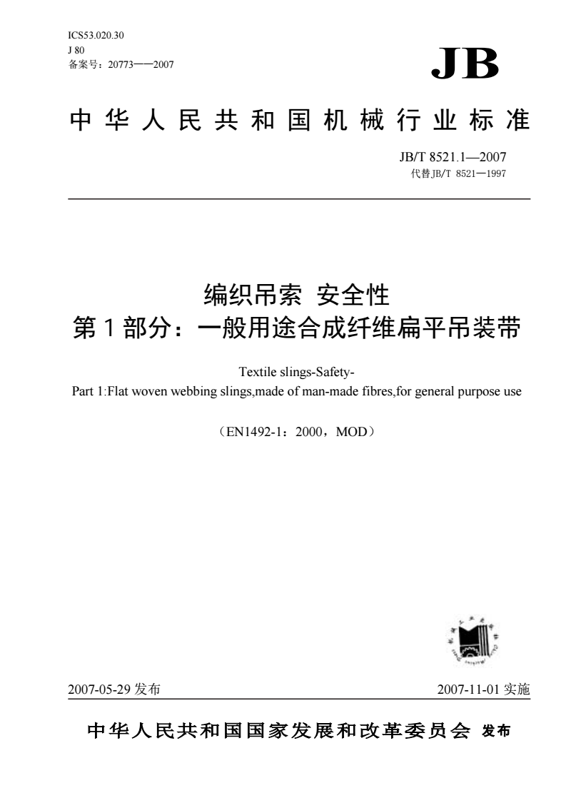 JB/T 8521的本部分规定了宽度为25mm~320mm由聚酰胺、聚酯和聚丙烯合成纤维材料制成的扁平吊装带,以及单肢、两肢、三肢、四肢和环形吊装带(带或不带端配件)的定级和试验方法。