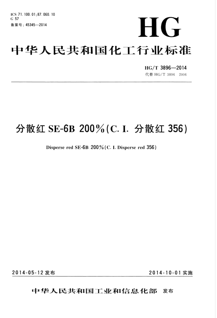 本标准规定了分散红SE-6B200%(C.I.分散红356)产品的要求、采样、试验方法、检验规则以及标志、标签、包装、运输和贮存。