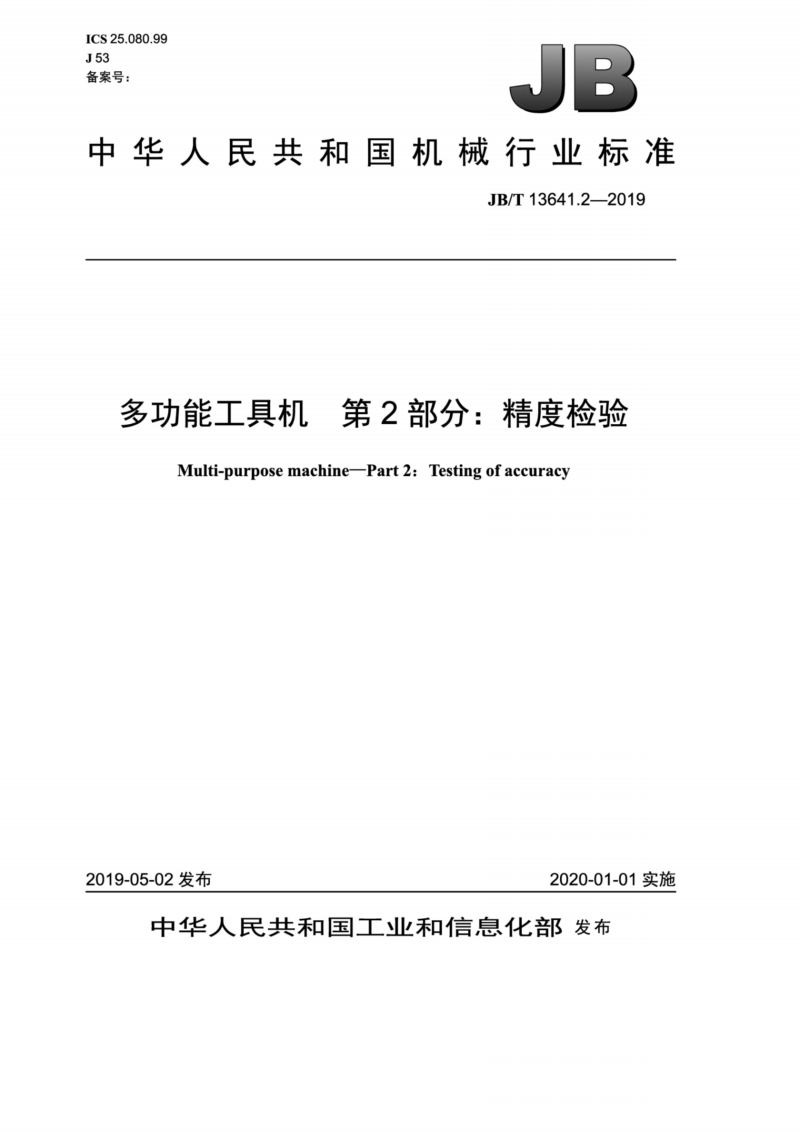 JB/T 13641的本部分规定了多功能工具机几何精度和工作精度的要求、检验方法以及相应的公差。