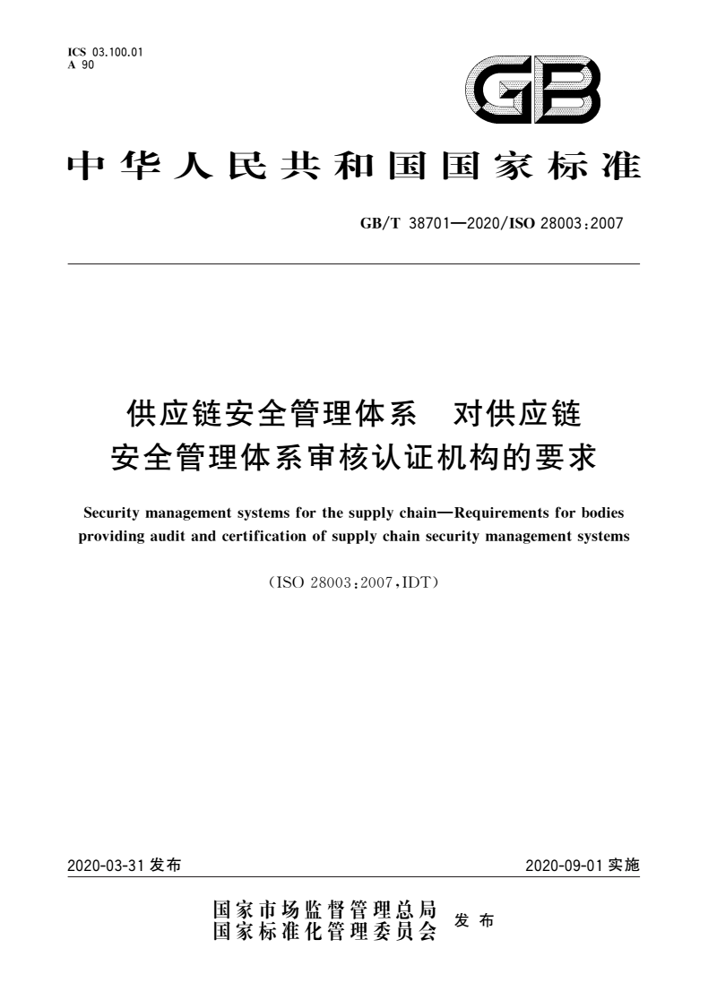 GB/T 38701-2020 供应链安全管理体系 对供应链安全管理体系审核认证机构的要求