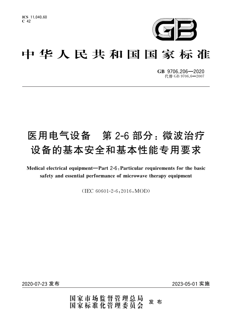 标准名称:医用电气设备 第2-6部分:微波治疗设备的基本安全和基本性能专用要求
