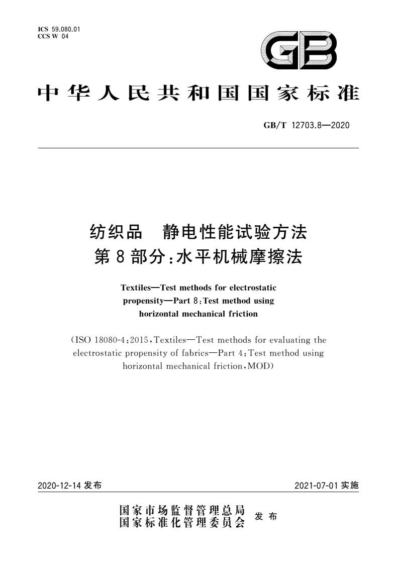 标准名称:纺织品 静电性能试验方法 第8部分:水平机械摩擦法