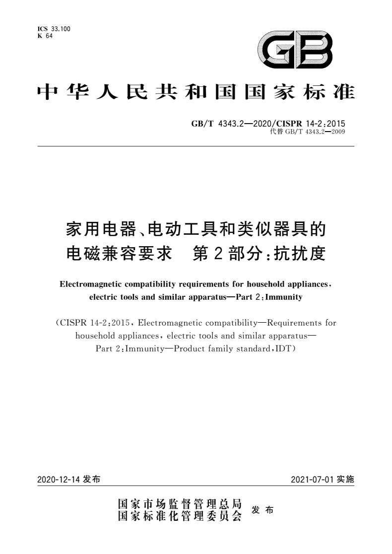 标准名称:家用电器、电动工具和类似器具的电磁兼容要求 第2部分:抗扰度