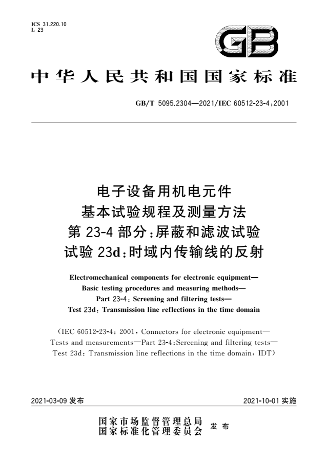 GB/T 5095.2304-2021 电子设备用机电元件 基本试验规程及测量方法 第23-4部分:屏蔽和滤波试验 试验23d:时域内传输线的反射