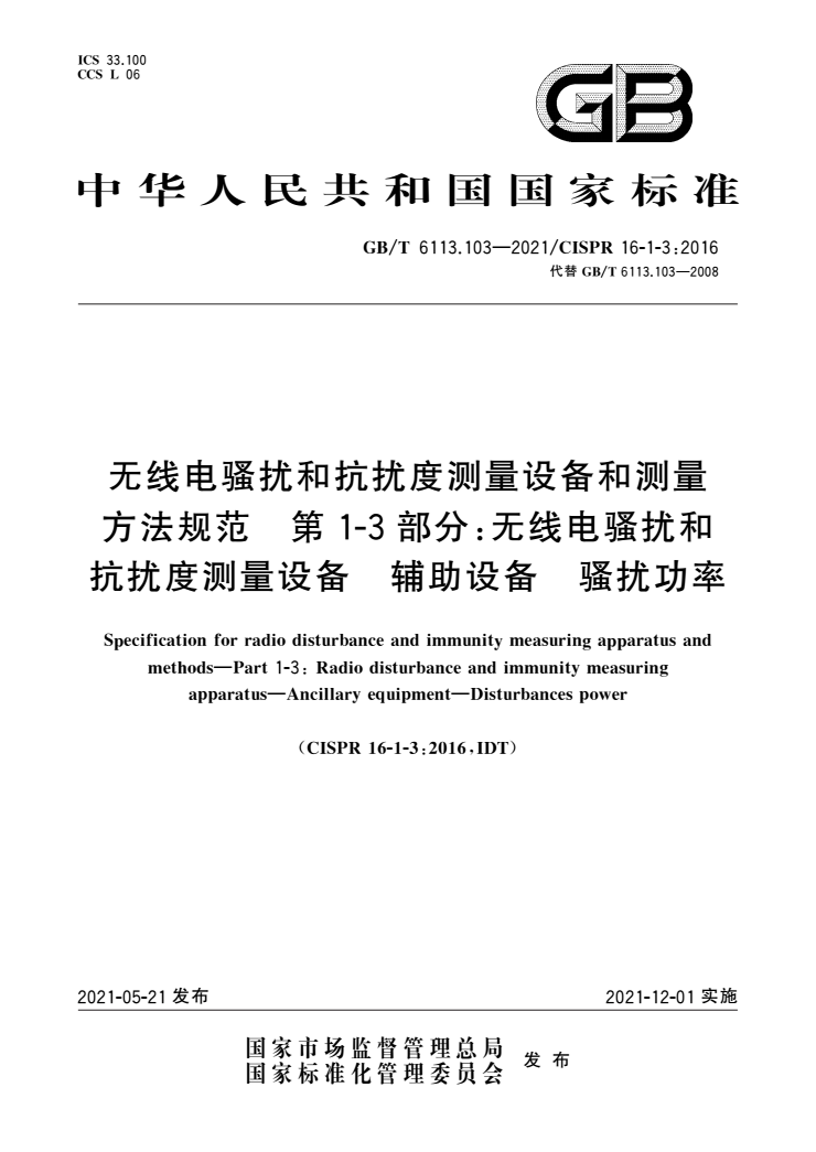 GB/T 6113.103-2021 无线电骚扰和抗扰度测量设备和测量方法规范 第1-3部分:无线电骚扰和抗扰度测量设备 辅助设备 骚扰功率