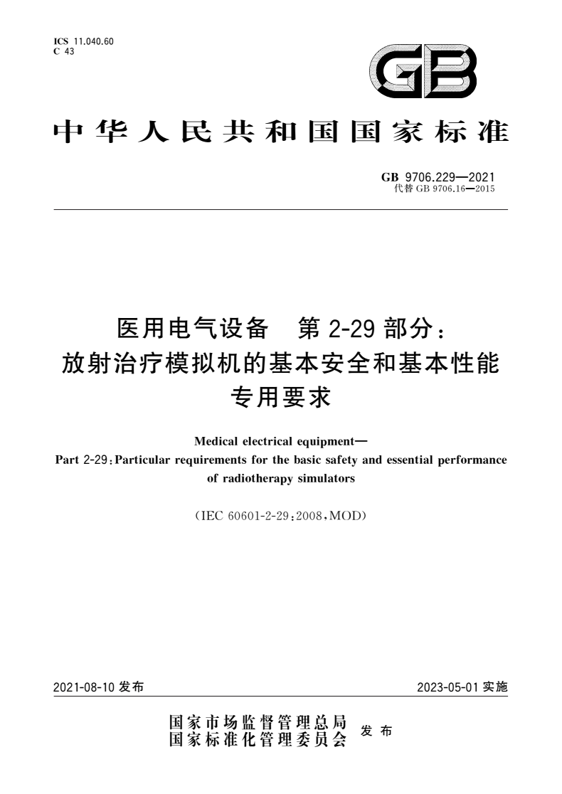 标准名称:医用电气设备 第2-29部分:放射治疗模拟机的基本安全和基本性能专用要求