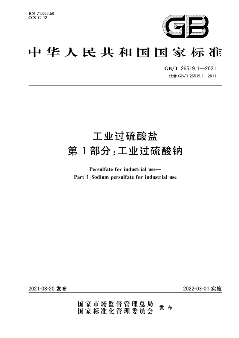 标准名称:工业过硫酸盐 第1部分:工业过硫酸钠