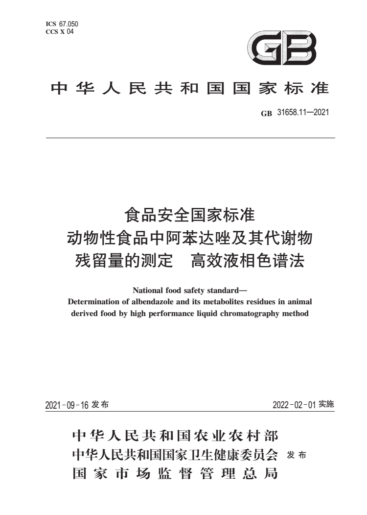 标准名称:食品安全国家标准 动物性食品中阿苯达唑及其代谢物残留量的测定 高效液相色谱法