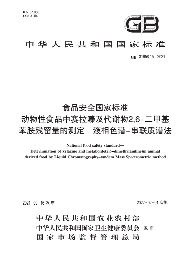 GB 31658.15-2021 食品安全国家标准 动物性食品中赛拉嗪及代谢物2,6-二甲基苯胺残留量的测定 液相色谱-串联质谱法