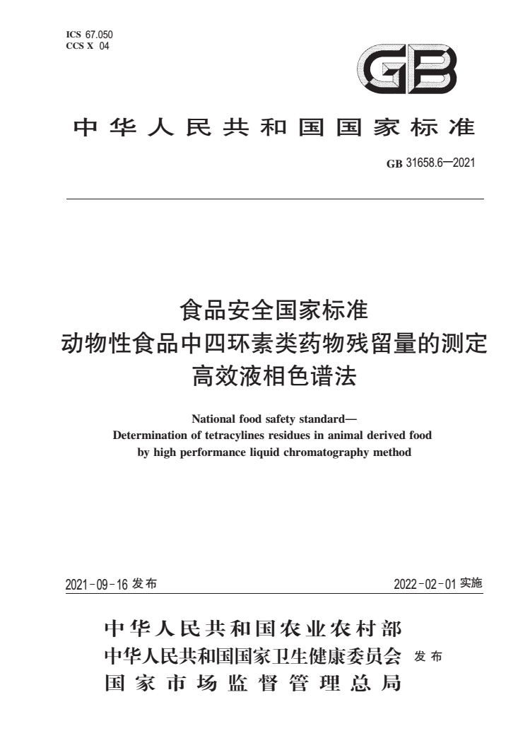 英文名称:National food safety standard-Determination of tetracylines residues in animal derived food by high performance liquid chromatography method