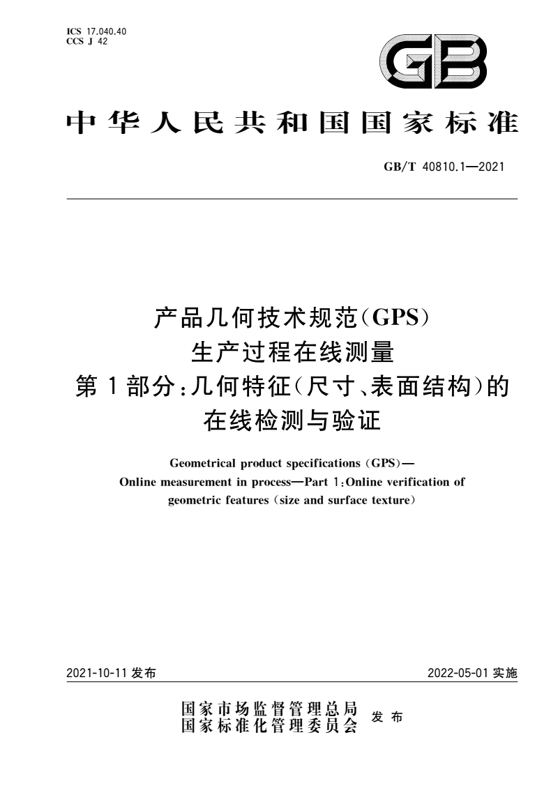 英文名称:Geometrical product specifications (GPS)—Online measurement in process—Part 1:Online verification of geometric features (size and surface texture)