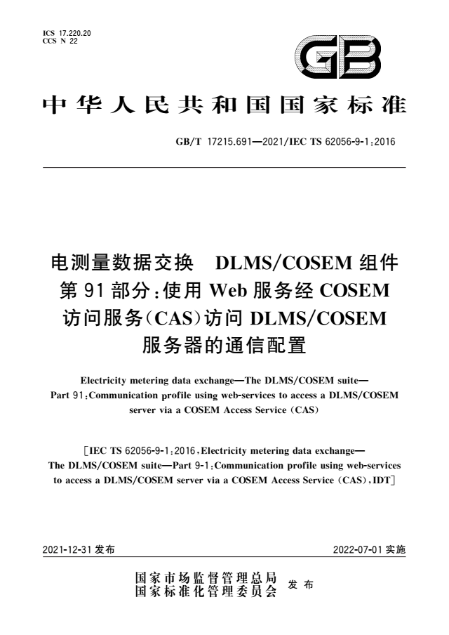 标准名称:电测量数据交换 DLMS/COSEM组件 第91部分:使用Web服务经COSEM访问服务(CAS)访问DLMS/COSEM服务器的通信配置