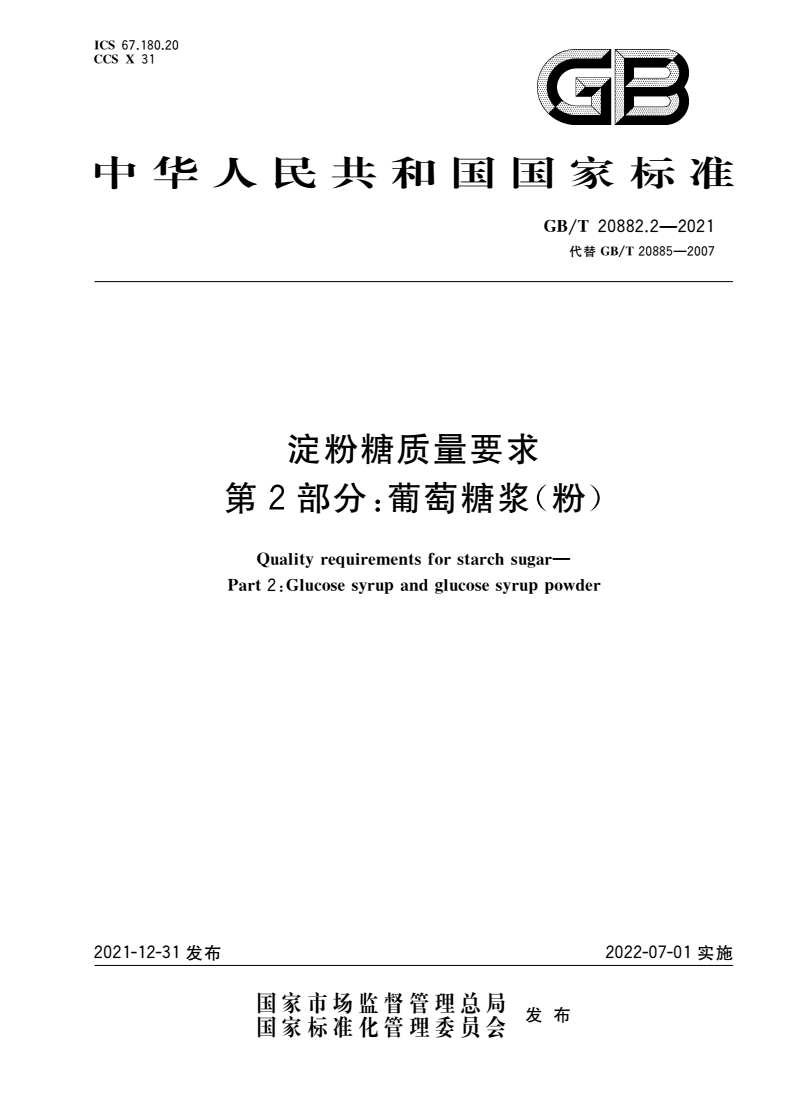 英文名称:Quality requirements for starch sugar—Part 2:Glucose syrup and glucose syrup powder