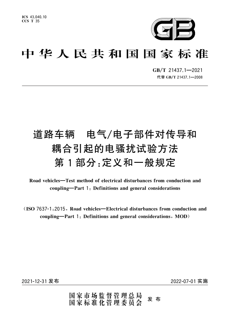 标准名称:道路车辆 电气/电子部件对传导和耦合引起的电骚扰试验方法 第1部分:定义和一般规定