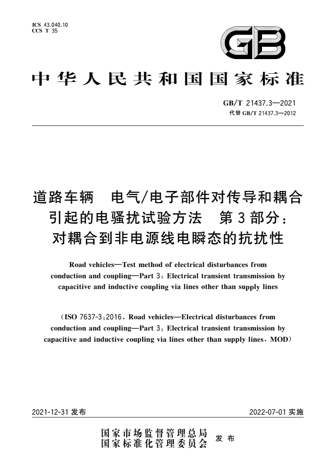 标准名称:道路车辆 电气/电子部件对传导和耦合引起的电骚扰试验方法 第3部分:对耦合到非电源线电瞬态的抗扰性