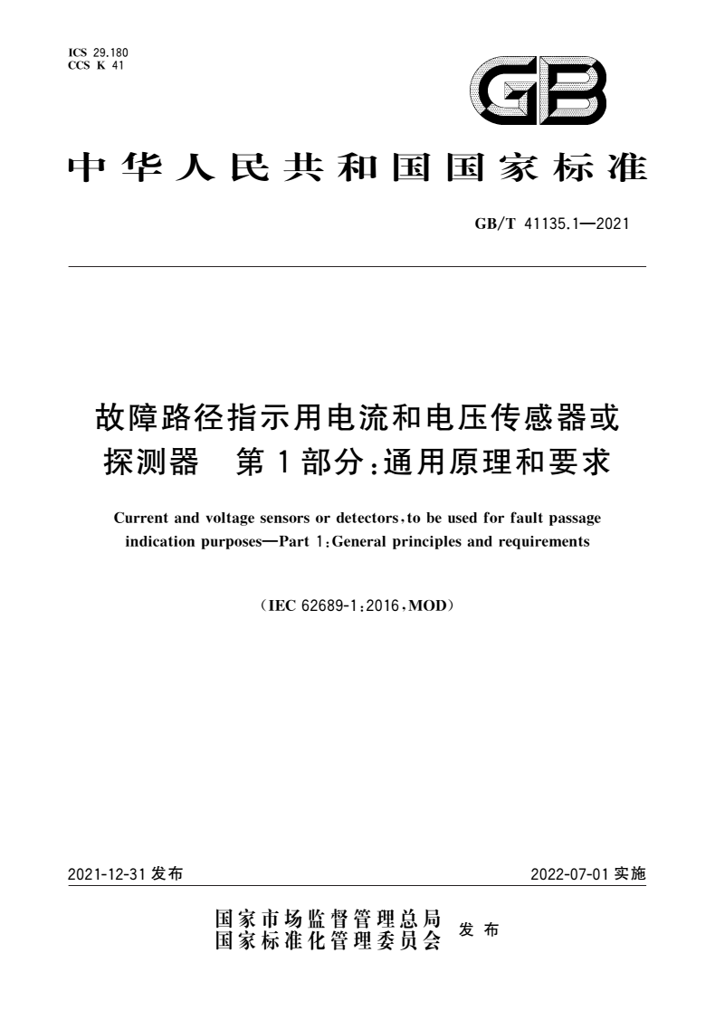 GB/T 41135.1-2021 故障路径指示用电流和电压传感器或探测器 第1部分:通用原理和要求