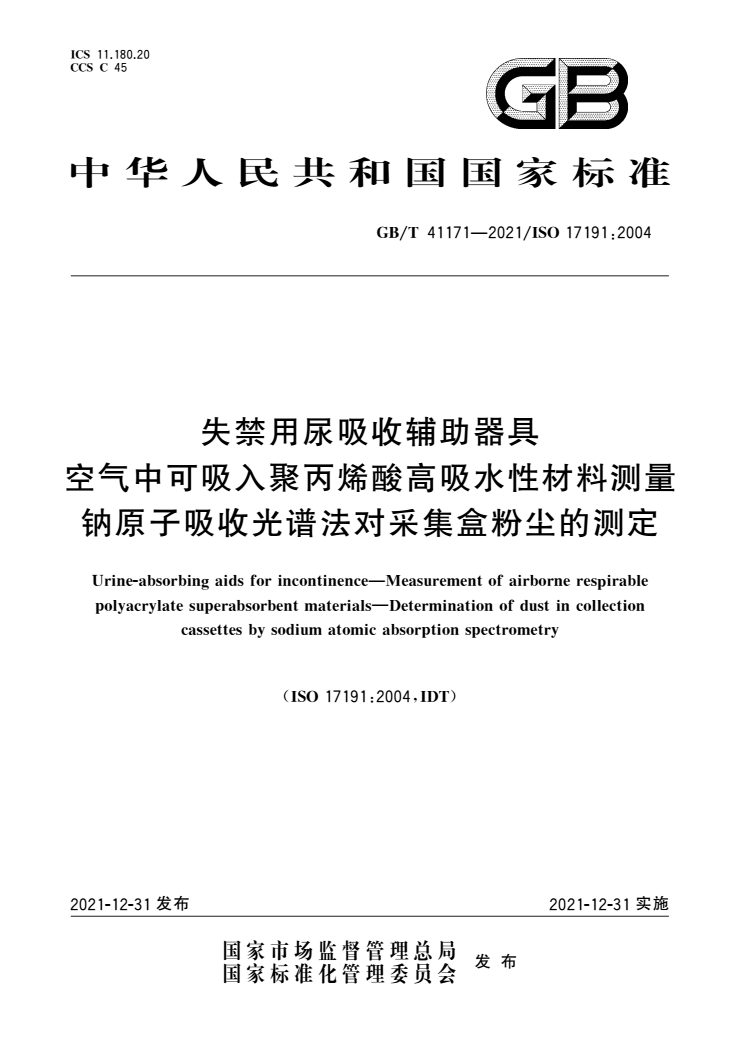 GB/T 41171-2021 失禁用尿吸收辅助器具 空气中可吸入聚丙烯酸高吸水性材料测量 钠原子吸收光谱法对采集盒粉尘的测定