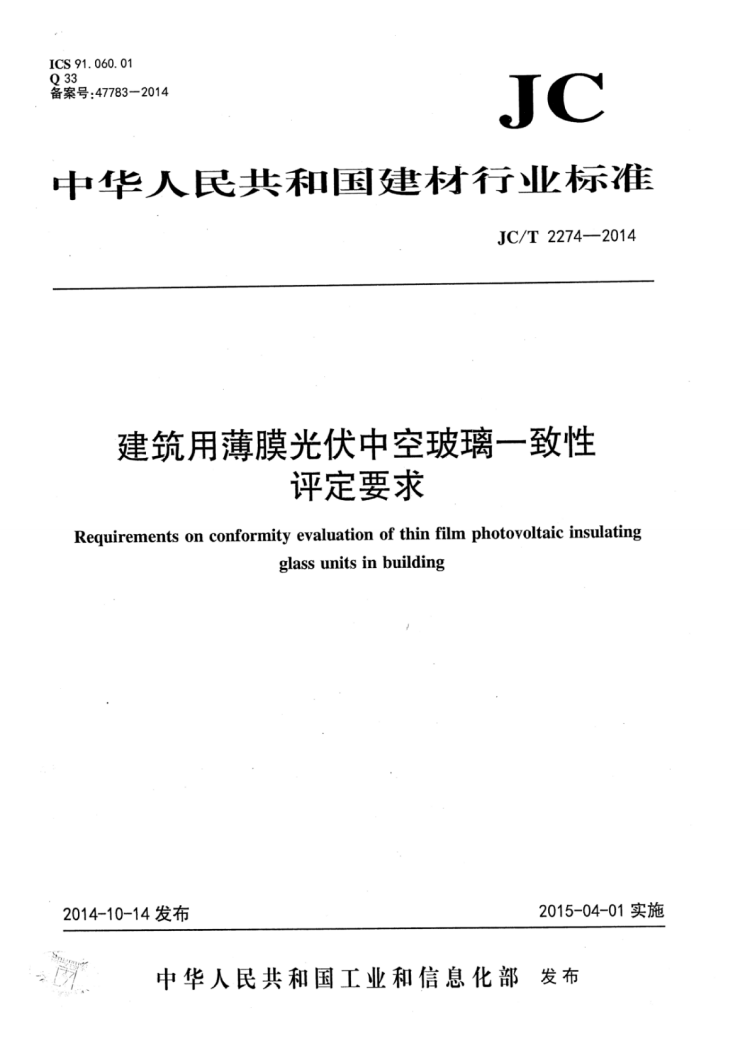 标准编号:JC/T 2274-2014