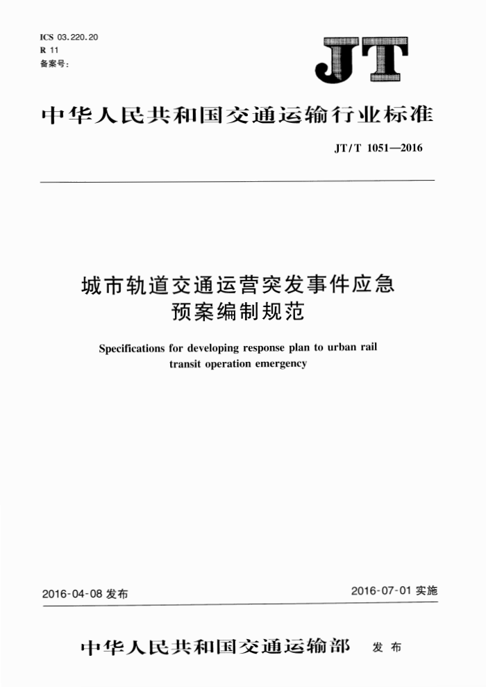 英文名称:Specifications for developing response plan to urban rail transit operation emergency