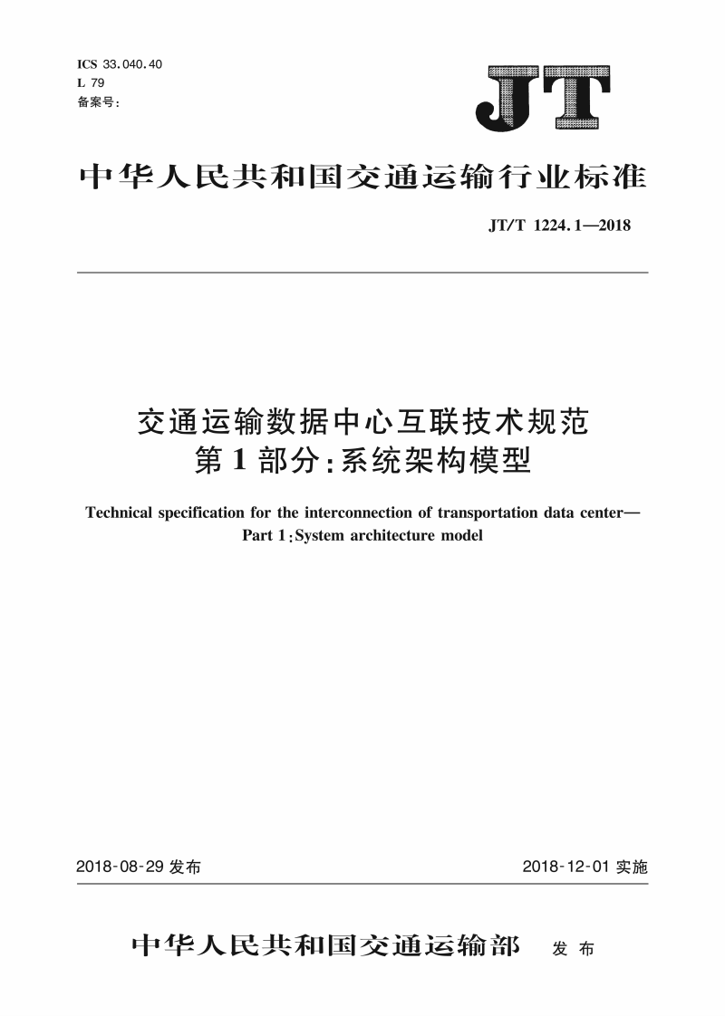 JT/T1224的本部分规定了交通运输数据中心互联的基本原则、互联系统架构、功能要求及主要性能要求。