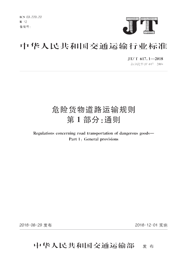 英文名称:Regulations concerning road transportation of dangerous goods——Part1:General provisions