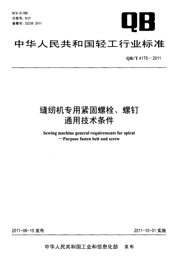 QB/T 4175-2011 缝纫机专用紧固螺栓、螺钉 通用技术条件