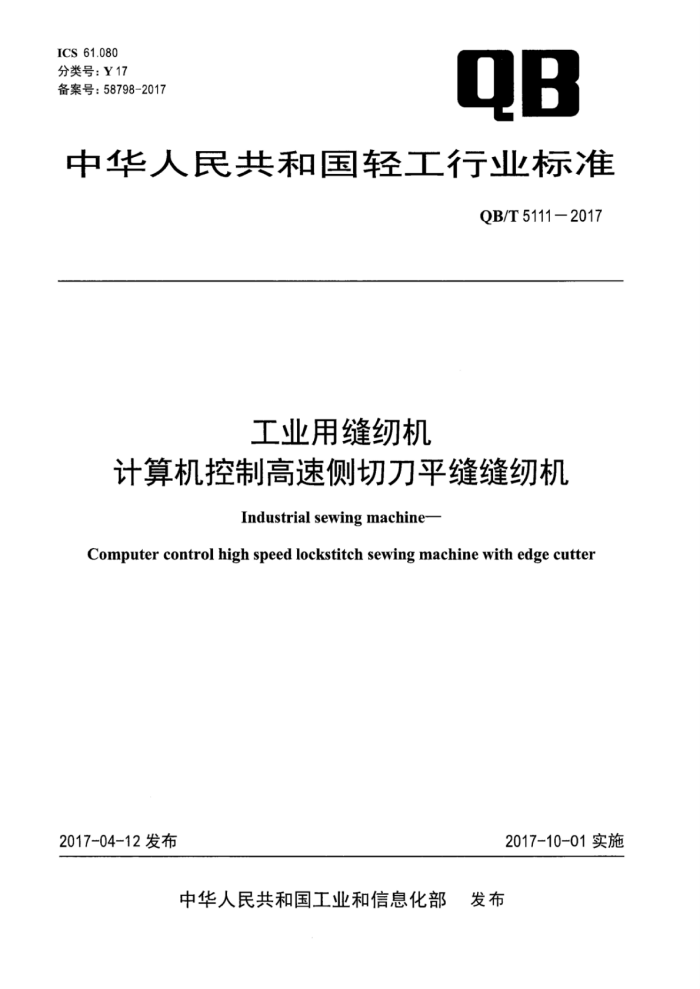 标准名称:工业用缝纫机 计算机控制高速侧切刀平缝缝纫机