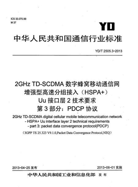 标准名称:2GHz TD-SCDMA数字蜂窝移动通信网 增强型高速分组接入(HSPA+) Uu接口层2技术要求 第3部分:PDCP协议