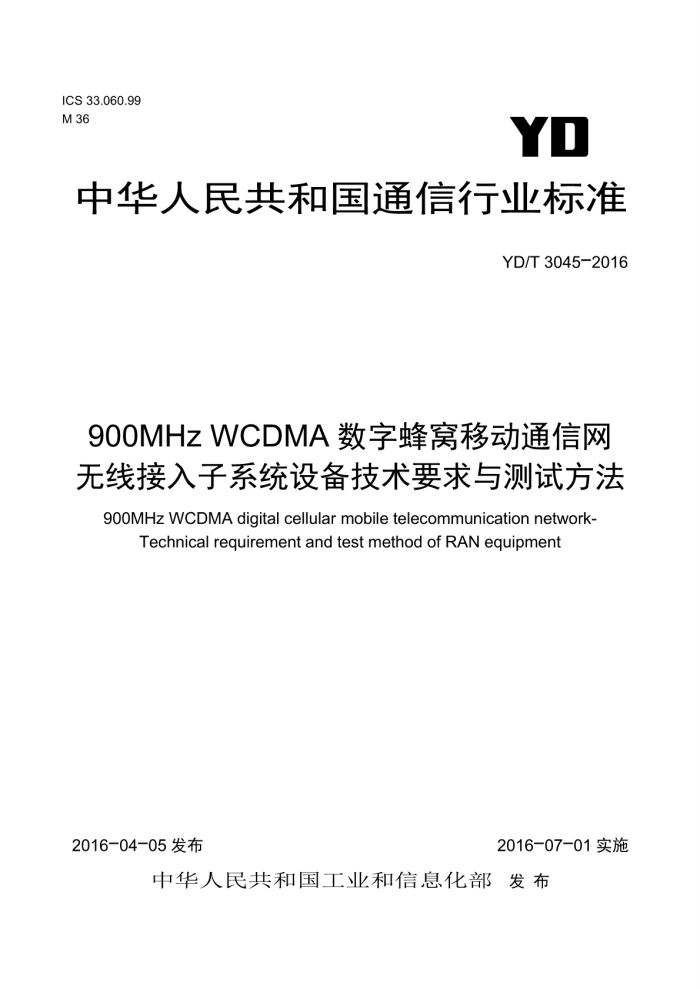 YD/T 3045-2016 900MHz WCDMA数字蜂窝移动通信网 无线接入子系统设备技术要求与测试方法