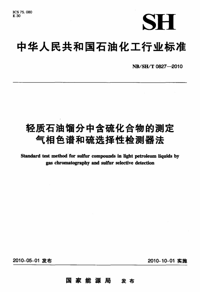 NB/SH/T 0827-2010 轻质石油馏分中含硫化合物的测定 气相色谱和硫选择性检测器法