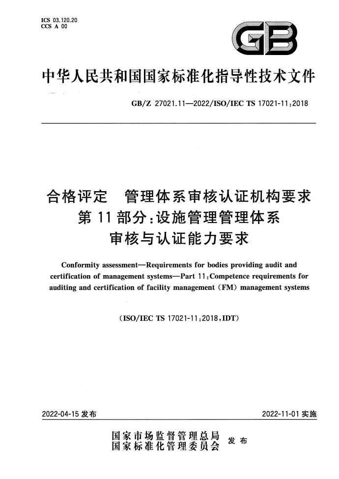 英文名称:Conformity assessment—Requirements for bodies providing audit and certification of management systems—Part 11:Competence requirements for auditing and certification of facility management (FM) management systems