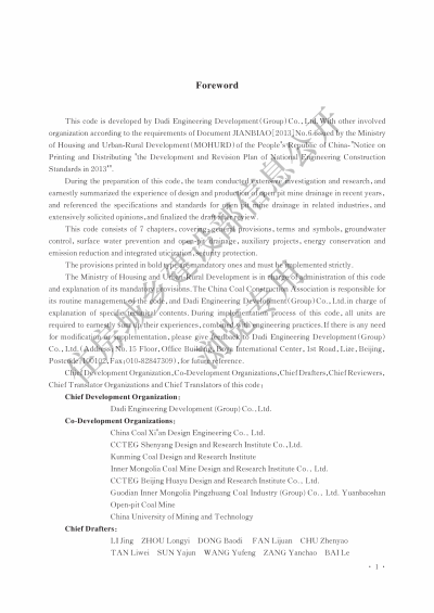 英文名称:Code for design of dewatering and draining in open pit mine of coal industry
