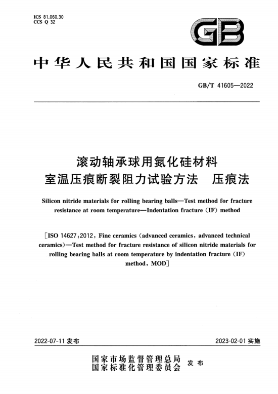 标准名称:滚动轴承球用氮化硅材料 室温压痕断裂阻力试验方法 压痕法