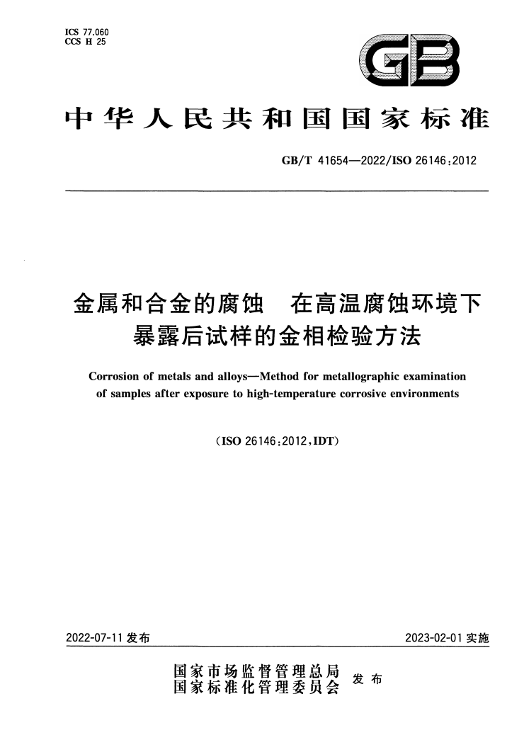 GB/T 41654-2022 金属和合金的腐蚀 在高温腐蚀环境下暴露后试样的金相检验方法