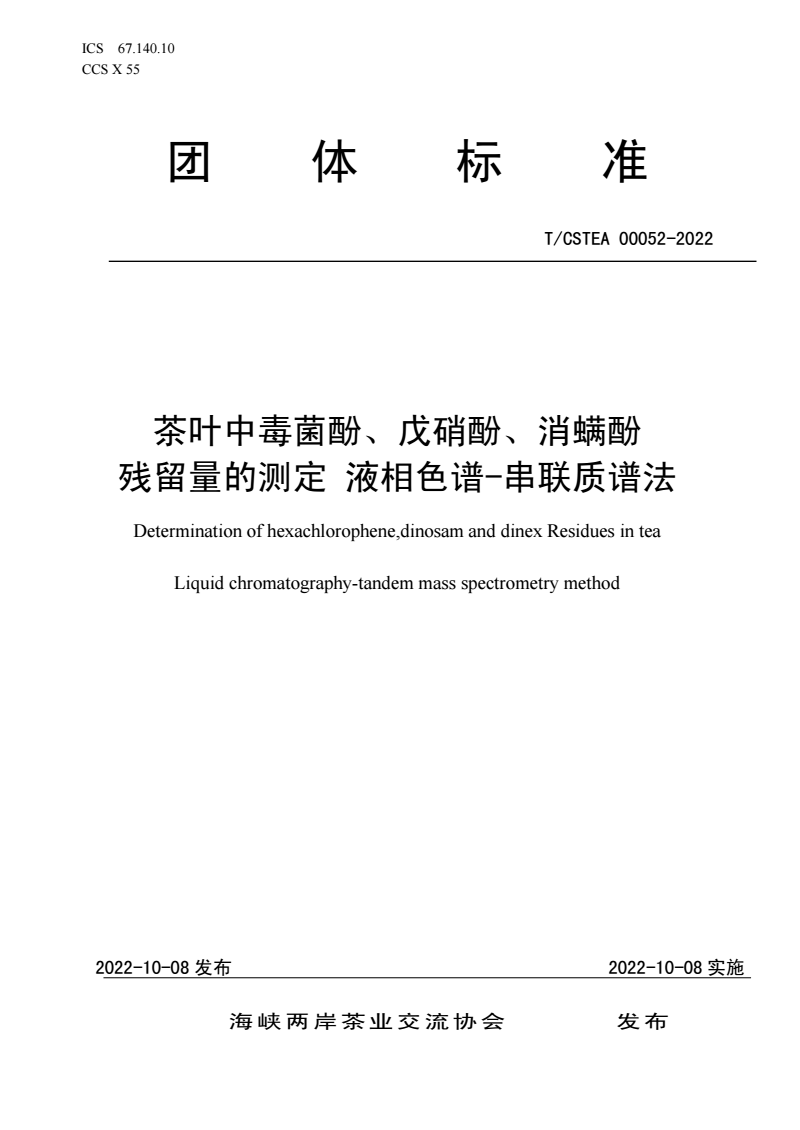 标准名称:茶叶中毒菌酚、戊硝酚、消螨酚 残留量的测定 液相色谱-串联质谱法