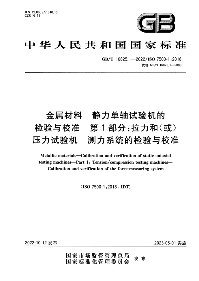 GB/T 16825.1-2022 金属材料 静力单轴试验机的检验与校准 第1部分:拉力和(或)压力试验机 测力系统的检验与校准