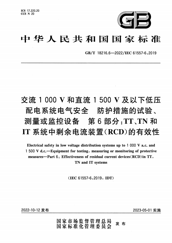 标准名称:交流1000V和直流1500V及以下低压配电系统电气安全 防护措施的试验、测量或监控设备 第6部分:TT、TN和IT系统中剩余电流装置(RCD)的有效性