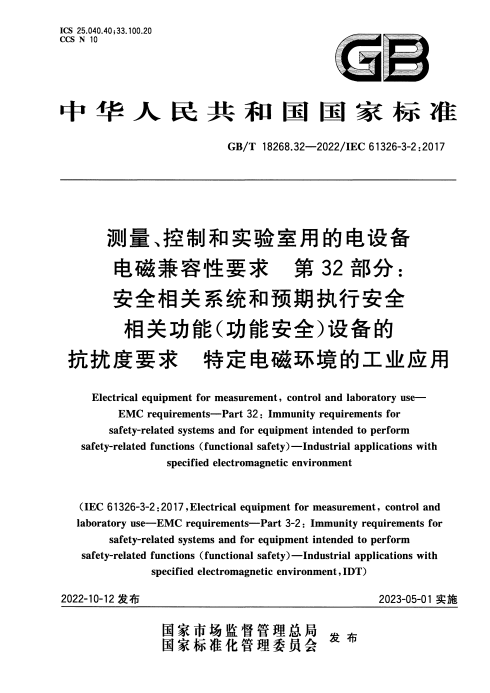 标准名称:测量、控制和实验室用的电设备 电磁兼容性要求 第32部分:安全相关系统和预期执行安全相关功能(功能安全)设备的抗扰度要求 特定电磁环境的工业应用