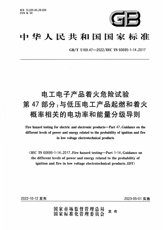 标准名称:电工电子产品着火危险试验 第47部分:与低压电工产品起燃和着火概率相关的电功率和能量分级导则