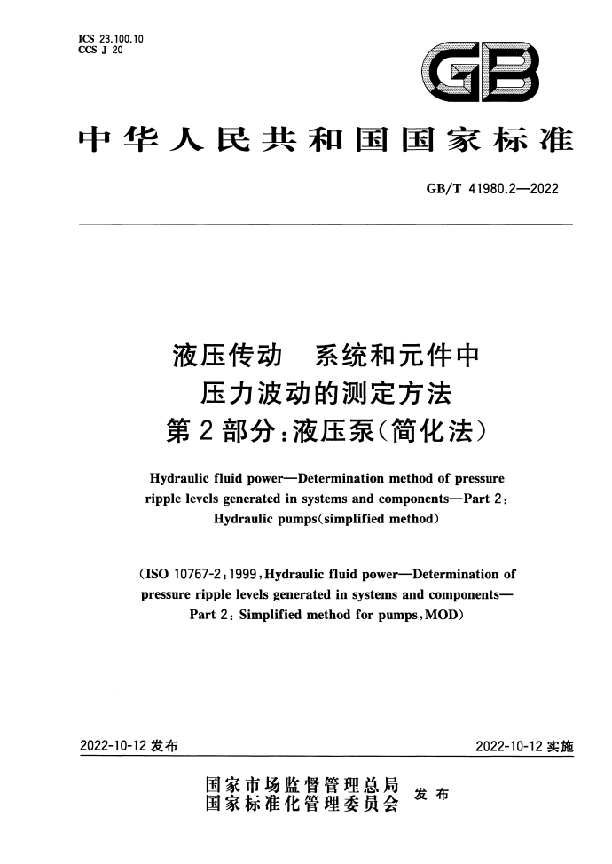 标准名称:液压传动 系统和元件中压力波动的测定方法 第2部分:液压泵(简化法)