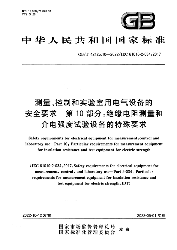 英文名称:Safety requirements for electrical equipment for measurement,control and laboratory use—Part 10:Particular requirements for measurement equipment for insulation resistance and test equipment for electric strength