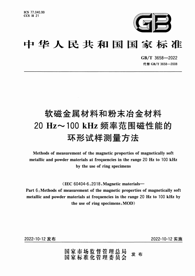 标准名称:软磁金属材料和粉末冶金材料20Hz~100kHz频率范围磁性能的环形试样测量方法
