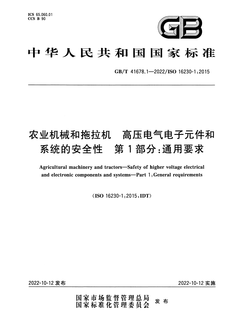 英文名称:Agricultural machinery and tractors—Safety of higher voltage electrical and electronic components and systems—Part 1:General requirements