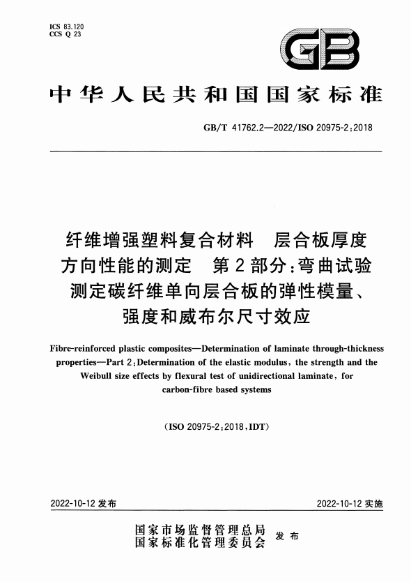 GB/T 41762.2-2022 纤维增强塑料复合材料 层合板厚度方向性能的测定 第2部分:弯曲试验测定碳纤维单向层合板的弹性模量、强度和威布尔尺寸效应