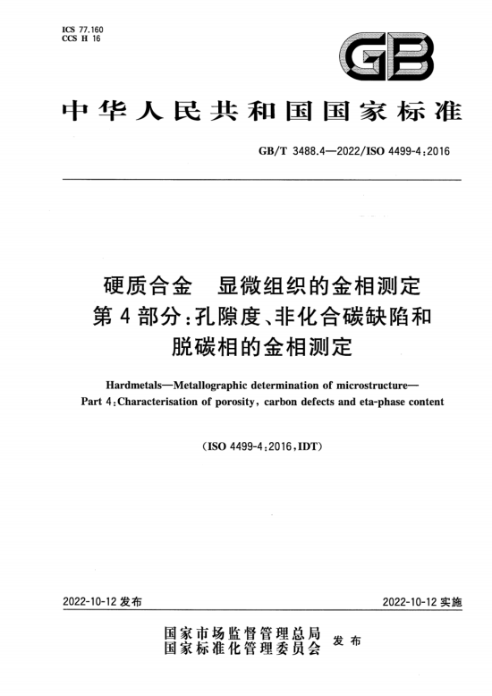 标准名称:硬质合金 显微组织的金相测定 第4部分:孔隙度、非化合碳缺陷和脱碳相的金相测定