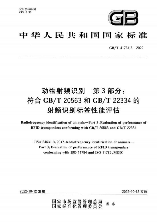 标准名称:动物射频识别 第3部分:符合GB/T 20563和GB/T 22334的射频识别标签性能评估