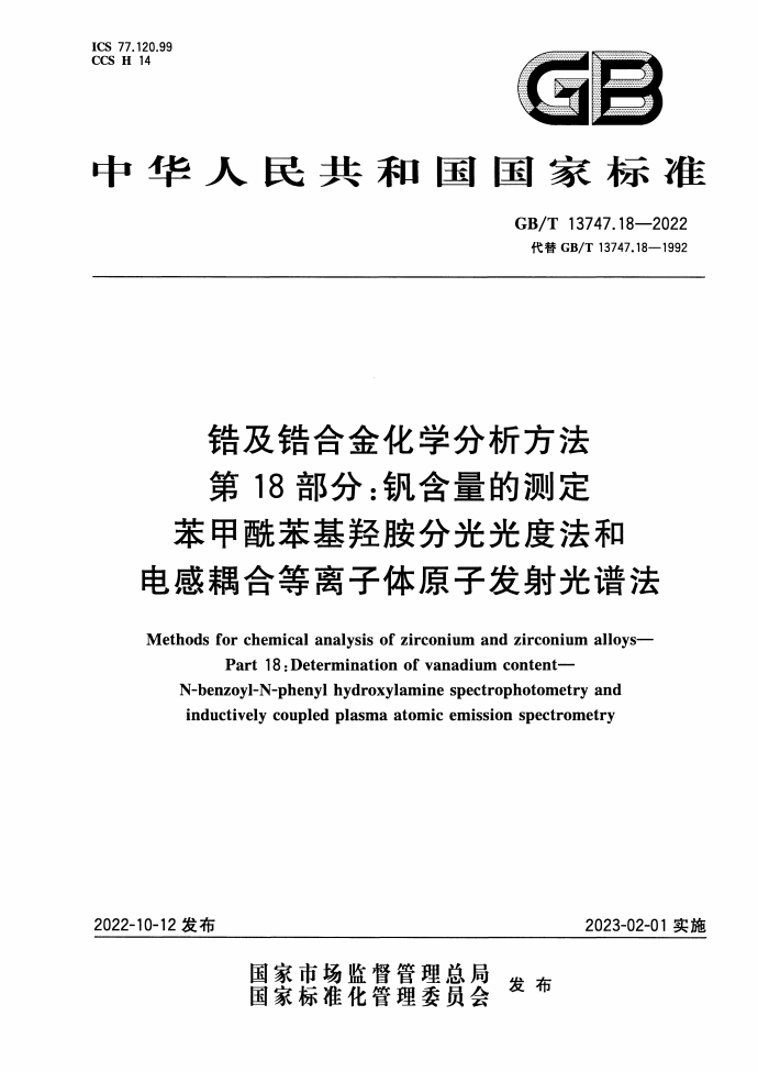 GB/T 13747.18-2022 锆及锆合金化学分析方法 第18部分:钒含量的测定 苯甲酰苯基羟胺分光光度法和电感耦合等离子体原子发射光谱法