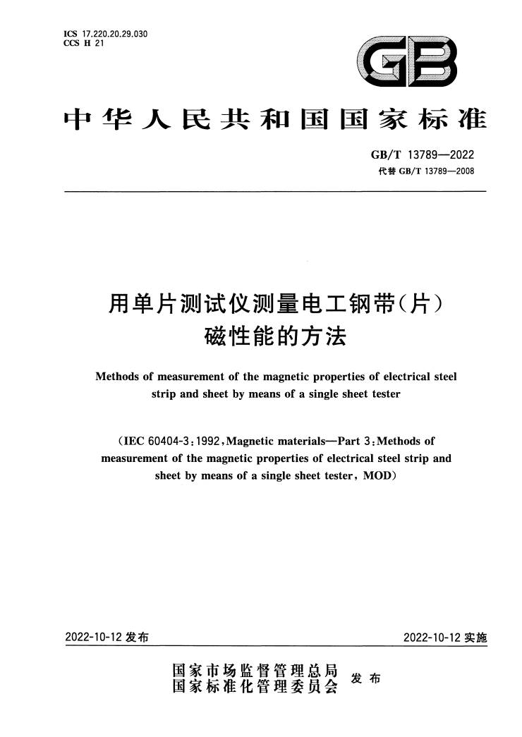GB/T 13789-2022 用单片测试仪测量电工钢带(片)磁性能的方法