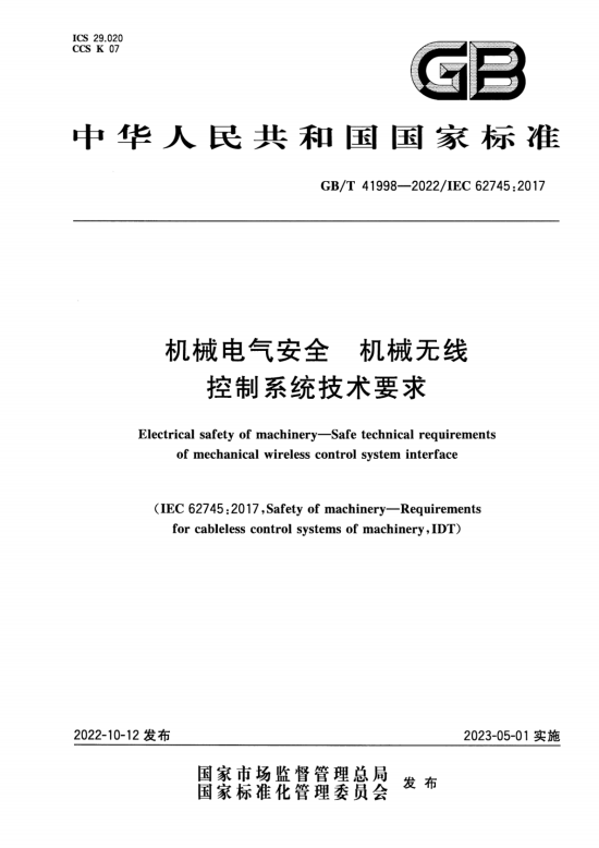 标准名称:机械电气安全 机械无线控制系统技术要求