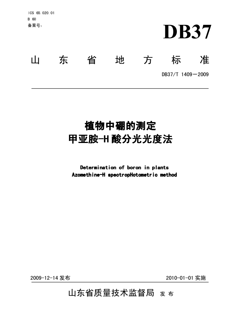 英文名称:Determination of boron in plants Azomethine-H spectropHotometric method